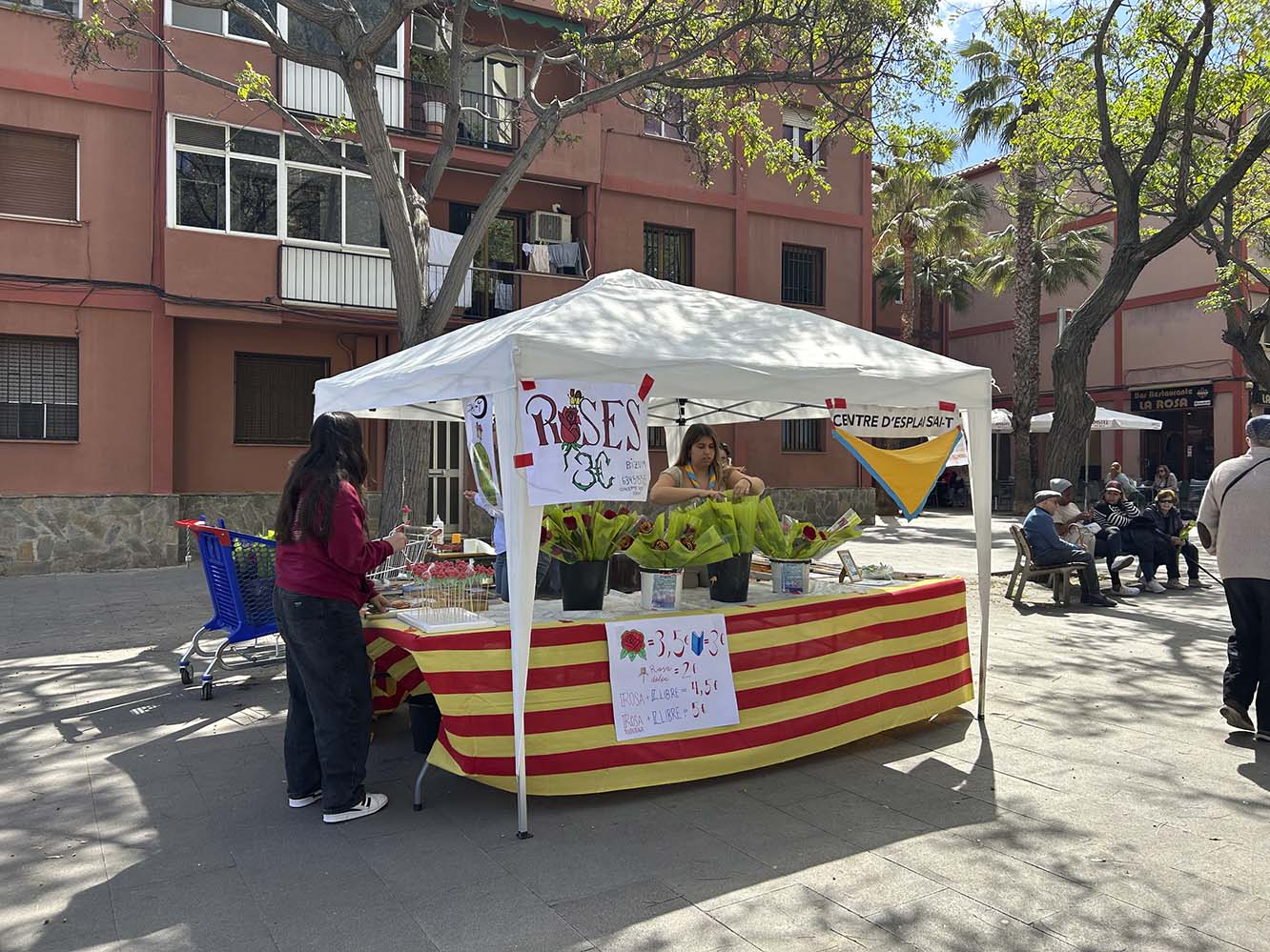 Són floristeries improvisades, plenes de vida i de color, que ofereixen molt més que flors. Dracs de peluix, punts de llibre, roses de ceràmica i de sabó. Les tradicionals roses vermelles comparteixen espai amb varietats grogues, roses i blaves, moltes embolcallades amb senyeres o paper de cel·lofana transparent. La gent s’atura, mira, remena, pregunta preus. N’hi ha qui compra amb pressa, com qui fa un tràmit. Però també hi ha qui aprofita per parlar amb els venedors, fer una foto o simplement compartir un somriure.