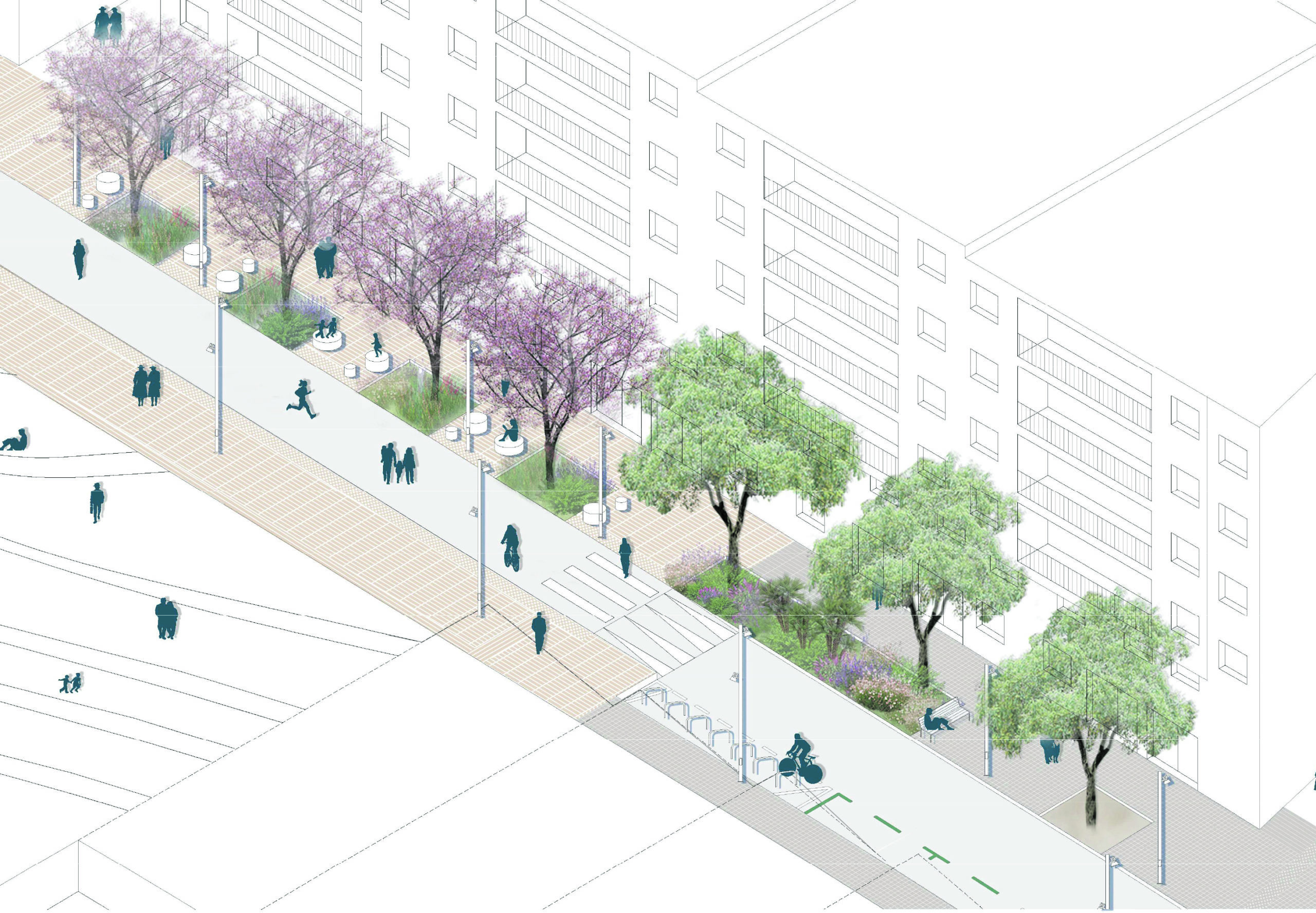 La regidora de Sants – Montjuïc, Raquel Gil, ha destacat que es tracta d’un treball que permetrà “dignificar el carrer i fer-lo més amable, incorporant espais verds i espais més amplis”. En aquest sentit, la nova organització del carrer planteja diferents propostes per trams, buscant donar prioritat a vianants i ciclistes. Entre el carrer de Bartomeu Pi i fins a l’accés futur al recinte de Can Batlló, la calçada serà en plataforma única i la resta del carrer lluirà segregat amb un carril per a vehicles. En tot el carrer s’ampliarà la vorera de la banda de plaça d’Espanya, que passarà de tenir 1,8 metres a 4,5 metres d’amplada. A més, s’hi plantaran fins a 24 arbres nous que sumaran verd als 11 exemplars actuals que es conservaran.