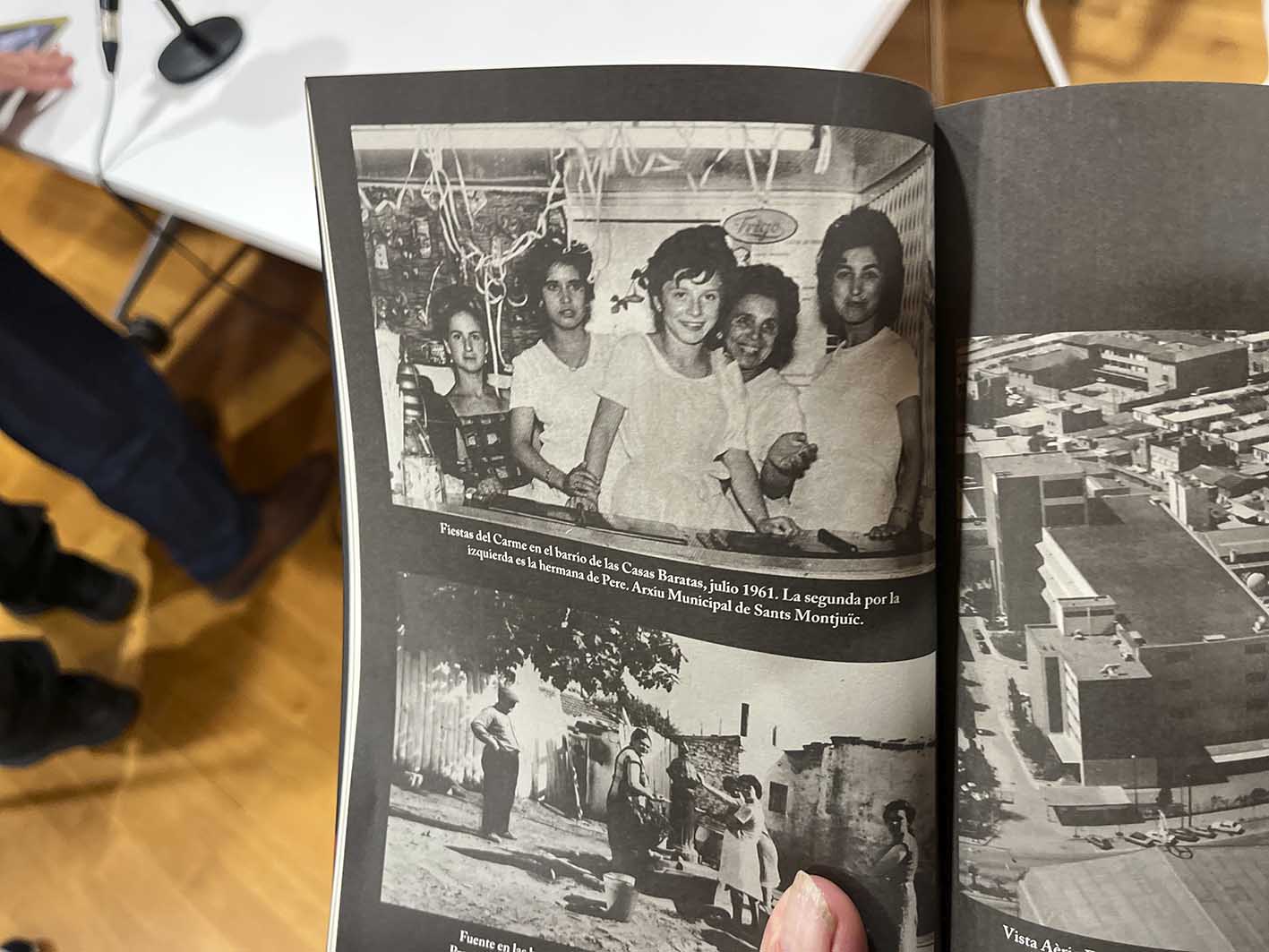La trobada es va obrir amb la projecció d’un vídeo sobre les barriades i els serveis de la Marina durant el segle passat. Imatges de La Capa, SEAT, Can Tunis, Cases Barates, ‘Lámpara Zeta’, la Miniwatt i Can Navarro van despertar l’alegria i els murmuris de l’audiència que s’havia aplegat a la sala d’actes de la biblioteca. Durant la presentació, en Pedro estava acompanyat de l’Iñaki García, portaveu del centre cívic El Lokal, ubicat al Raval i encarregat de l’edició d’aquesta obra.