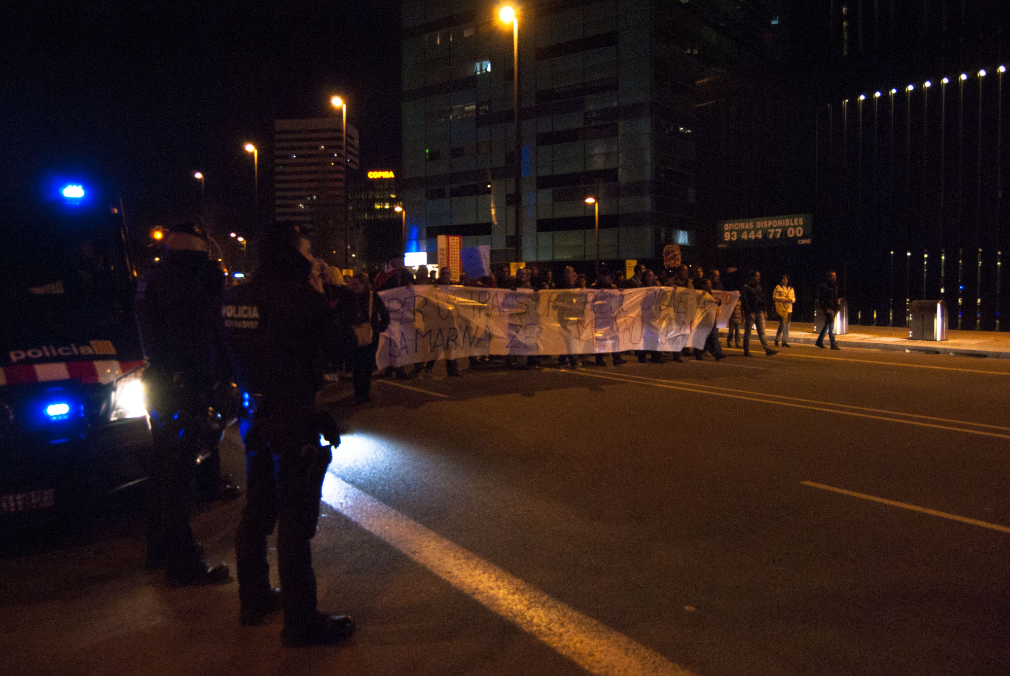 A mesura que la manifestació s’apropa a l’última parada, es veuen més assistents al Congrés, i més es repeteix el “móvil ya tenemos”. “El congrés causa problemes de trànsit a hores puntes”, explica Xavier González, de l’Assemblea de la Marina, un altre organitzador. Creu, però que es tracta més d’una reivindicació: “El problema és que no s’utilitza cap benefici del que aporta el Mobile World Congress a Barcelona per millorar el barri, per exemple, amb un transport com el metro; si el congrés ingressa tants diners, en un any el pots fer”. La manifestació arriba a la Fira Gran Via, seu del Mobile World Congress i punt final, passades les vuit i mitja. En acabar la manifestació s’anuncia la convocatòria per la propera el dissabte, que anirà fins la plaça Espanya. “S’ha de tenir en compte que aquesta és una manifestació per escalfar motors. El dia 14 esperem ser més gent”, explica Xavier González. L’objectiu, altre cop, fer-se veure, però encara més: “Volem anar a la plaça Espanya perquè la resta de Barcelona sàpiga el problema que tenim”, conclou.