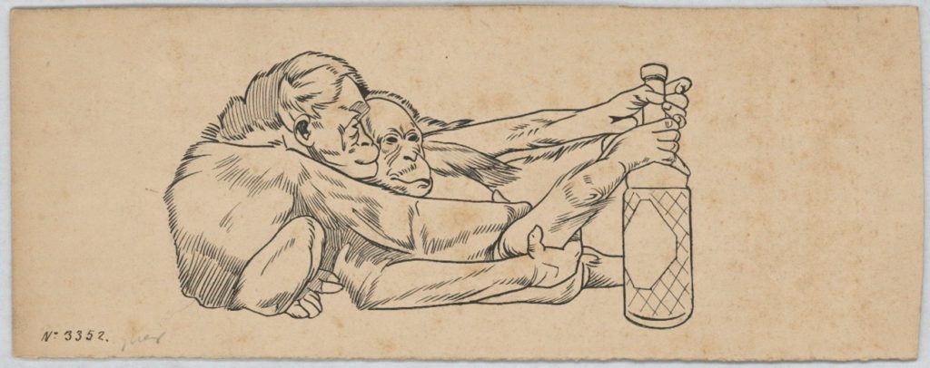 Projecte per a un cartell d’«Anís del mono». Dibuix amb tinta a la ploma sobre cartró (c. 1897) de n’Alexandre de Riquer. Web del Museu Nacional d’Art de Catalunya de Barcelona, www.museunacional.cat