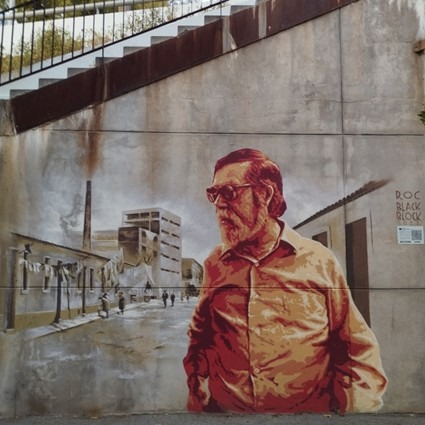 Mural de Roc Black Block (2022) al peu de les escales del Polvorí, que ha servit de portada a On la ciutat canvia de nom (2025), edició catalana de la novel·la d’en Candel del 1957. Fotografia del Rubén Cruz, el 4 de novembre del 2025.