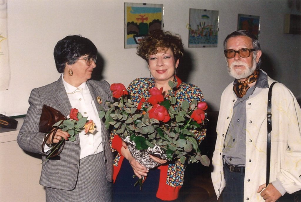 Maruja i Paco Candel acompanyen la Núria Feliu després d’una actuació al saló d’actes de l’Escola Bàrkeno (abril de 1986). Fotografia de Josep Vicens Busquets.