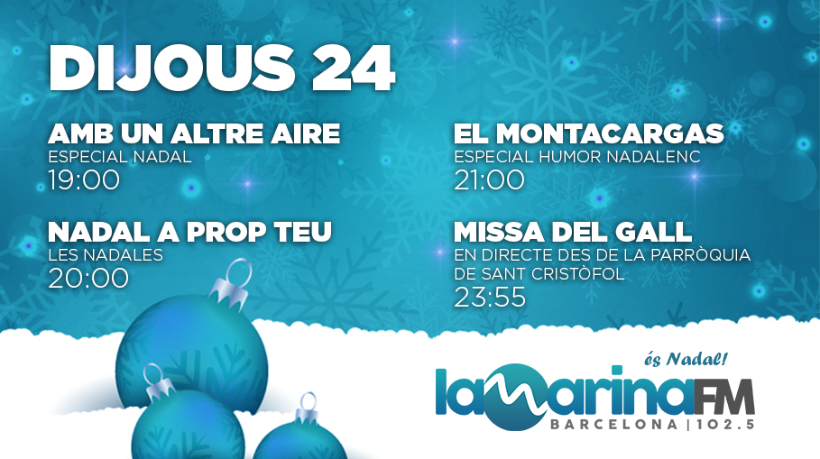 Aquest Nadal, La Marina FM és més a prop teu que mai! Dijous 24 de desembre encarem la Nit de Nadal amb l’especial Amb un altre aire presentat per Jordi Carreter a les 19h. El programa de les parròquies del barri comptarà en aquesta ocasió amb col·laboradors especials com en Josep Armentano, que ha recorregut els carrers de la Marina per trobar les opinions dels veïns sobre el Nadal.