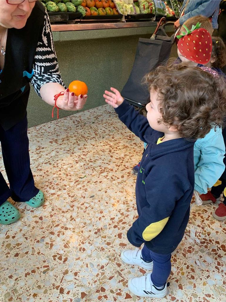 Quan hi arribem, tot és emoció! Hi ha parades i botiguers que ja ens coneixen… i nosaltres també els reconeixem a ells. El més divertit és quan arribem a la parada de fruita. Un a un, demanem què volem comprar i ho posem al nostre cistell. Ens agrada molt fer-ho nosaltres sols —ens fa sentir grans i importants!